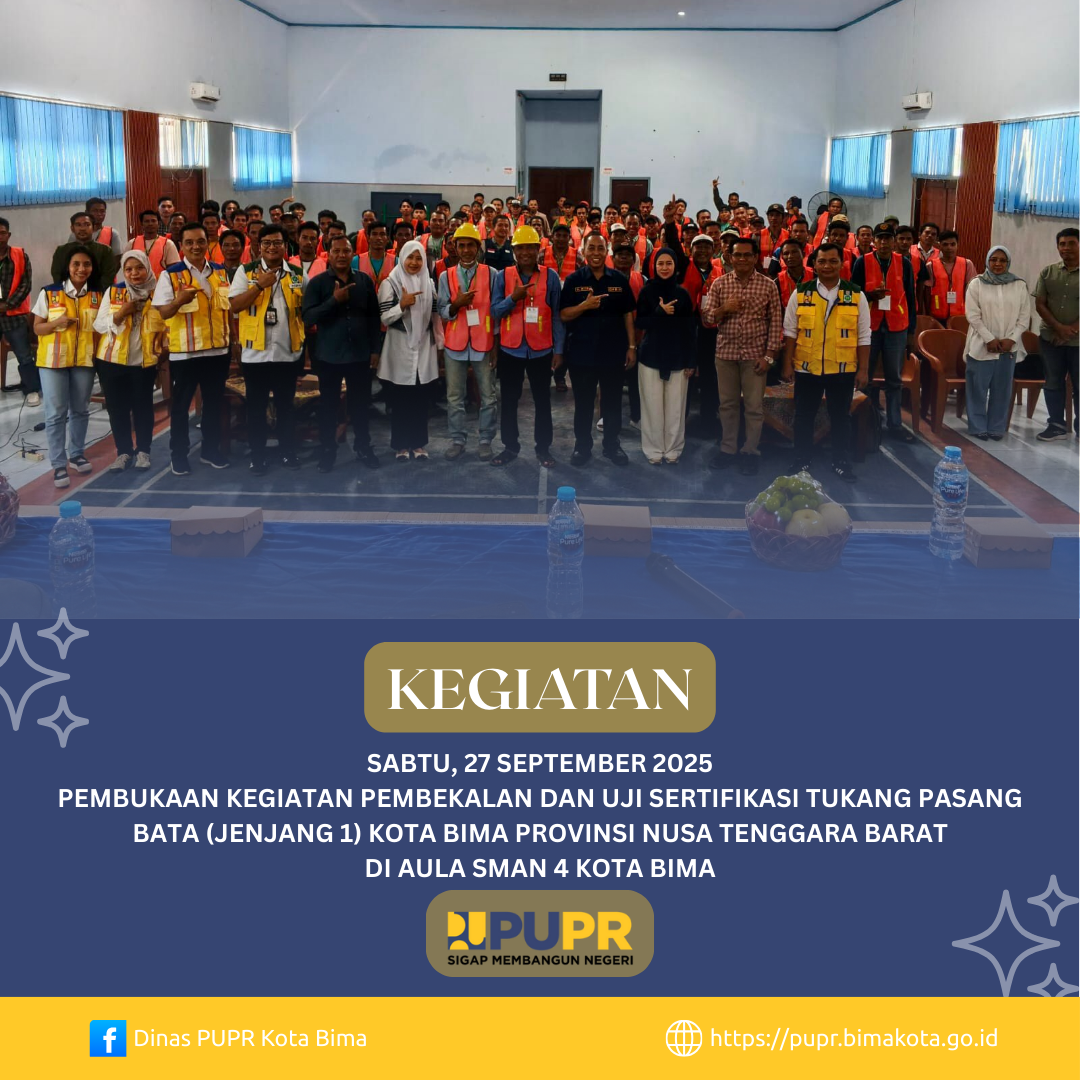 kepala Dinas Pekerjaan Umum dan Penataan Ruang Bapak Didi Fahdiansyah S.T.,M.T menghadiri pembukaan Kegiatan Pembekalan dan uji Sertifikasi Tenaga Kerja Konstruksi Tingkat Terampil Tukang Pasang Bata Jenjang 1 yang diadakan oleh Balai Jasa Konstruksi Wilayah IV Surabaya Direktorat Jendral Bina Konstruksi Kementrian Pekerjaan Umum dan Tata Ruang, Kadis PUPR hadir Bersama Anggota DPR RI Komisi V Bapak H. Mori Hanafi SE., M.Com, Kepala Balai Jasa Konstruksi Wilayah IV Surabaya,Hadir juga dalam Pembukaan Ibu Ketua Nasdem Kota Bima, Dan Anggota DPRD Kota Bima dari Partai Nasdem.Acara akan berlangsung selama 2 Hari 27-28 September 2025 dengan peserta 100 orang tukang yang berasal dari Kota Bima, Kabupten Bima Dan Kab Dompu.uji Sertifikasi Tukang Pasang Bata jenjang 1 ini sebagai upaya Peningkatan Sumberdaya Manusia di Bidang Jasa Konstruksi guna Mendukung pembangunan Infrastruktur di Kota Bima Provinsi Nusa Tenggara Barat.