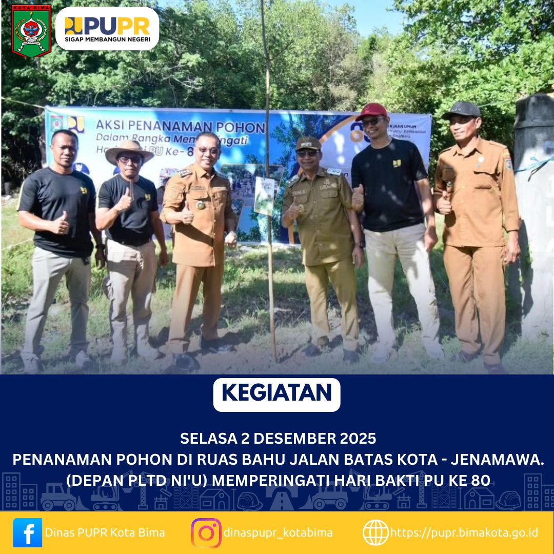 Bima – Dalam rangka memperingati Hari Bakti Pekerjaan Umum (PU) ke-80, Dinas Pekerjaan Umum dan Penataan Ruang (PUPR) Kota Bima melaksanakan kegiatan penanaman pohon di Ruas bahu jl. Batas Kota - Jenamawa. (Depan PLTD Ni'u) pada Selasa, 2 Desember.